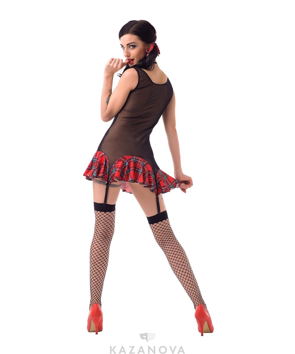 В костюм "Школьница-задира" входят: юбка, топ с пажами и галстуком.