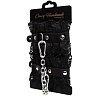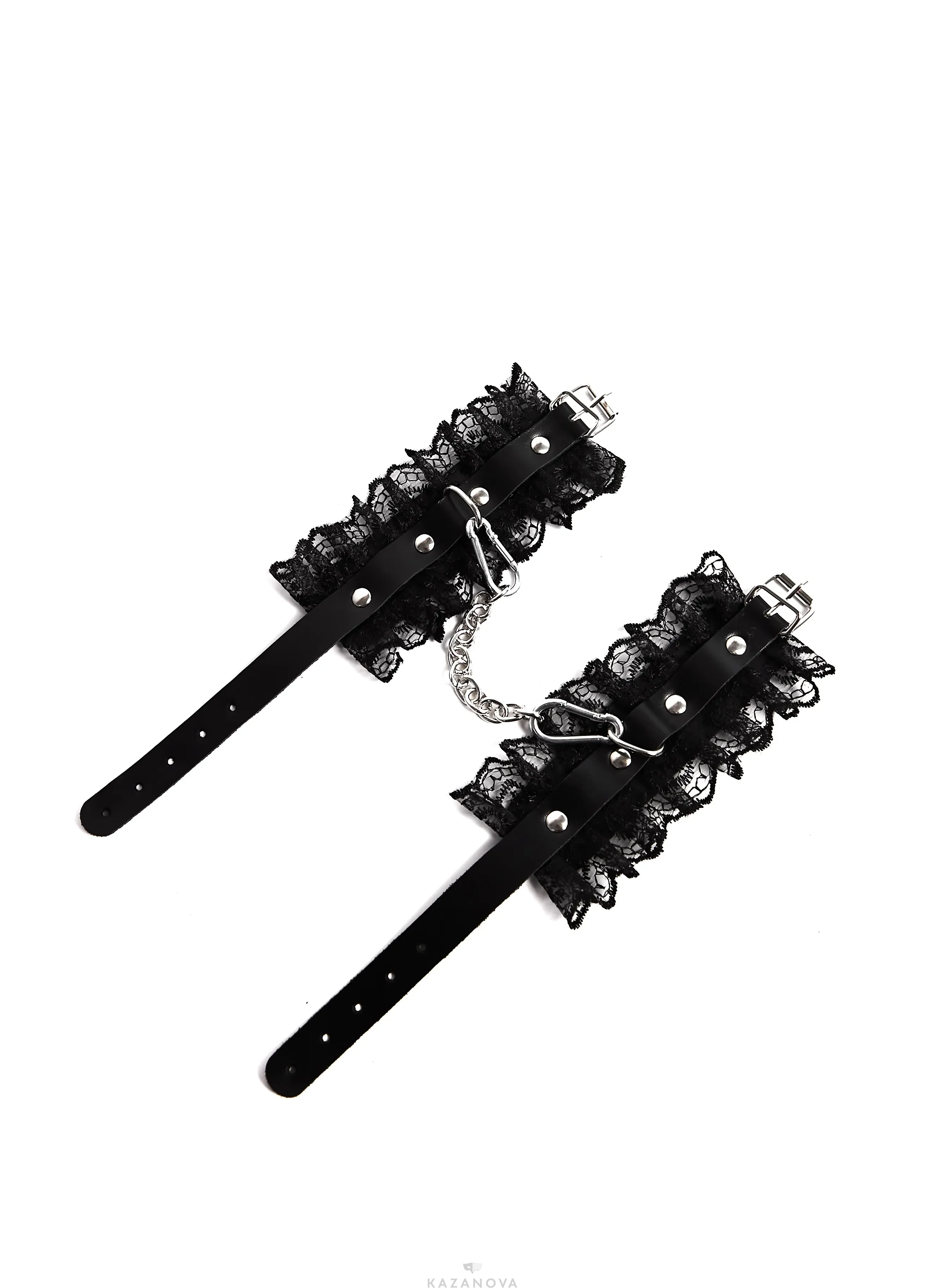 Оковы с кружевом выполнены из высококачественной натуральной кожи, которая обеспечивает мягкость и комфорт. Надежная стальная фурнитура с серебристым покрытием добавляет конструкции прочности и элегантности. В комплект входит прочный соединительный карабин, делая этот аксессуар универсальным для различных ситуаций.