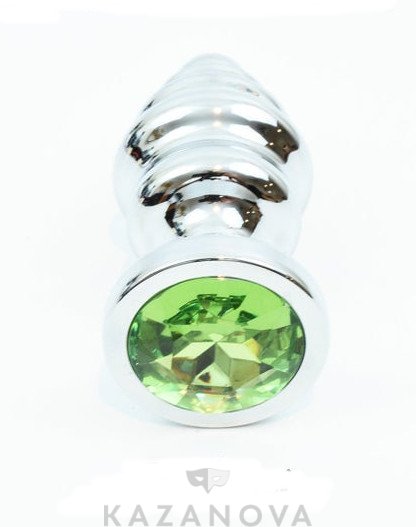Втулка анальная металлическая большая ребристая серебристая с светло-зеленым стразом 9,3 см